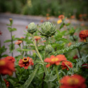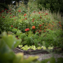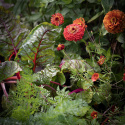 En gyllenrød kjøkkenhage er et frøpakke med en blanding som sprer varme selv på skytunge dager. De luksuriøse artisjokkene 'Green Globe' gir høyde i beplantingen som bader i et blomsterhav av oransjeglødende fløyelsblomster 'Burning Embers'. Gulrøtter 'Oxheart' og bladbete 'Rhubarb Chard' flammer i dypt rødoransje toner. Den friske romanosalaten 'Blonde maraîchère' roer ned med lysegrønne toner, mens sinnablomstene 'Oriole' stråler som små soler over bladverket.