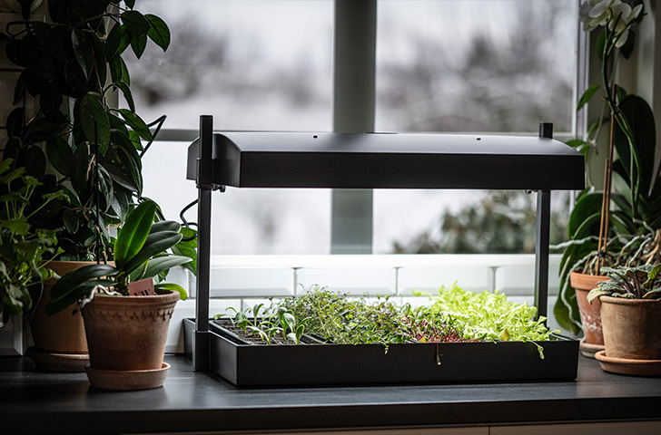 Velg plantebelysning med LED-pære for å spare energi. La lyset være tent i 16 timer per døgn. I de resterende timene får frøene den nødvendige døgnhvilen. Bruk gjerne en timer. Hvis du forkultiverer i et lyst vindu, kan du redusere antallet timer med belysning etter hvert som det naturlige lyset blir sterkere fra og med mars. Les mer i artikkelen Velg riktig vekstbelysning.