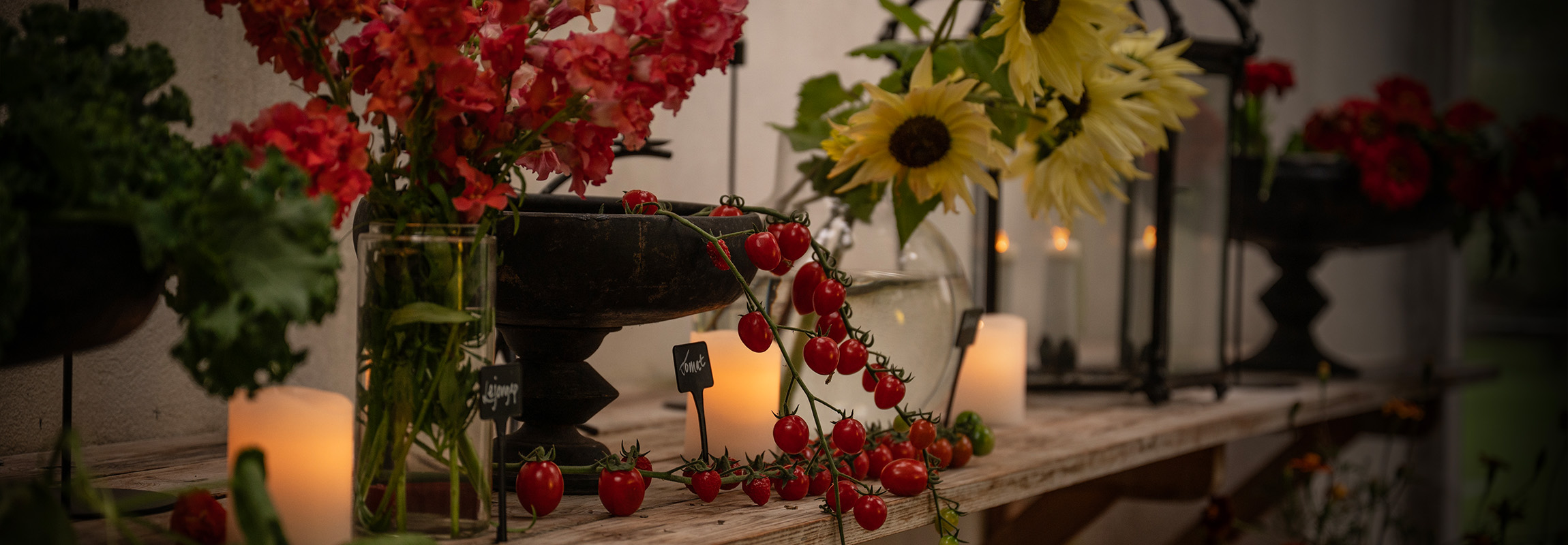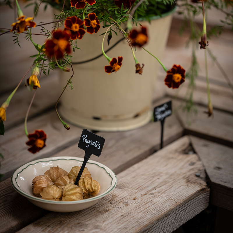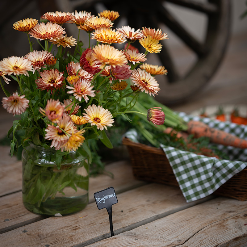 24. Prydløvemunn F1 'Madame Butterfly Bronze' + Rød solsikke 'Ms Mars' + Kornblom 'Black Boy' + Sommerasters 'King Size Apricot' + Hareøre 'Griffithii' + Dill 'Como' + Storbusthirse 'Red Jewel' + Bakkeknapp 'Fata Morgana'