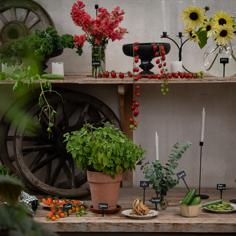 1. Romanosalat 'Little Gem' + Sommergulrot 'Amsterdam 3' + Ringblomst 'Orange Flash' + Brytsukkerert 'Delikett'2. Drivhusagurk F1 'Picolino' + Eukalyptus 'Baby Blue' + Sommergulrot 'Touchon'